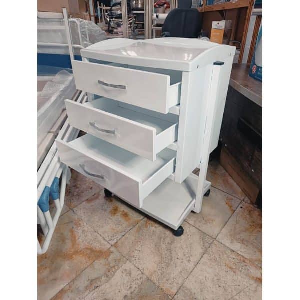 ترالی سه کشو رویه فایبر جهت استفاده در کلینیک های پزشکی و درمانی زیبایی به منظور قرار دادن وسایل و تجهیزات پزشکی با بالاترین کیفیت همراه با گارانتی در تجهیزات پزشکی خاکباز.